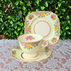 The gorgeous vintage English Bone china cup, saucers & side plates are a combination of soft pastel tones, some plain with a gold gilt trim, others patterned or floral and the best thing is that they they look gorgeous together.